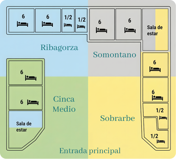 2 habitaciones de 6 y 2 habitaciones individuales o dobles